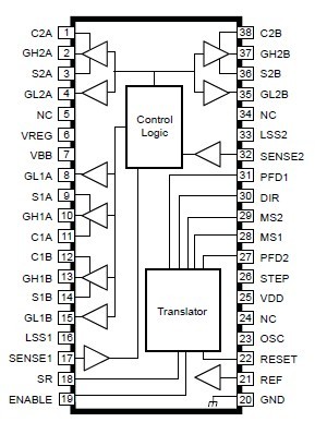 The A3986SLDTR-T is a dual full-bridge MOSFET driver with microstepping translator. It is suitable for driving a wide range of higher power industrial bipolar 2-phase stepper motors (typically 30 to 500 W). Its pacakge is 38 pin TSSOP (suffix LD).