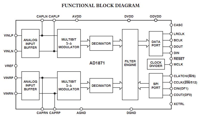 The AD1871YRSZ-REEL is a stereo audio ADC intended for digital audio applications requiring high performance analog-to-digital conversion. The AD1871YRSZ-REEL features two 24-bit conversion channels each with programmable gain amplifier (PGA), multibit sigma-delta modulator, and decimation filters. Each channel provides 105 db of dynamic range, making the AD1871YRSZ-REEL suitable for applications such as digital audio recorders and mixing consoles. The applications of the device include Professional Audio, Mixing Consoles, Musical Instruments, Digital Audio Recorders, Including CD-R, MD, DVD-R, DAT, HDD, Home Theater Systems, Automotive Audio Systems and Multimedia.