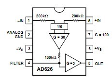 AD626ARZ-REEL features:(1)Pin Selectable Gains of 10 and 100; (2)Single Supply Range of +2.4 V to +10 V; (3)Dual Supply Range of ±1.2 V to ±6 V; (4)Wide Output Voltage Range of 30 mV to 4.7 V; (5)Low Input Offset Voltage: 500 mV max; (6)Large Common-Mode Range: 0 V to +54 V; (7)Low Power: 1.2 mW (VS = +5 V); (8)Good CMR of 90 dB typ; (9)Fast Settling Time: 24 ms (0.01%); (10)Series Resistive Inputs (RIN = 200 kV); (11)RFI Filters Included; (12)Allows 50 V Continuous Overload.