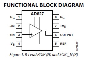AD627BRZ-REEL7 absolute maximum ratings: (1)Supply Voltage: ±18 V; (2)Internal Power Dissipation1 PDIP (N-8): 1.3 W; SOIC_N (R-8): 0.8 W; (3)-IN, +IN: -VS - 20 V to +VS + 20 V; (4)Common-Mode Input Voltage: -VS - 20 V to +VS + 20 V; (5)Differential Input Voltage (+IN - (-IN)): +VS - (-VS); (6)Output Short-Circuit Duration: Indefinite; (7)Storage Temperature Range (N, R): -65℃ to +125℃; (8)Operating Temperature Range: -40℃ to +85℃; (9)Lead Temperature (Soldering, 10 sec): 300℃.