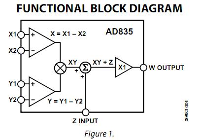 AD835ARZ features: (1)Simple: basic function is W = XY + Z; (2)Complete: minimal external components required; (3)Very fast: Settles to 0.1% of full scale (FS) in 20 ns; (4)DC-coupled voltage output simplifies use; (5)High differential input impedance X, Y, and Z inputs; (6)Low multiplier noise: 50 nV/√Hz.