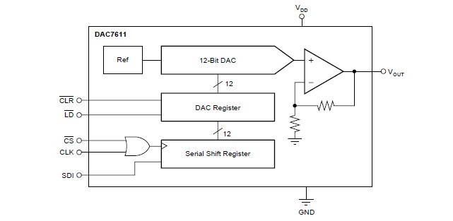 The DAC7617UB is a 12-bit digital-to-analog converter (DAC) with guaranteed 12-bit monotonicity performance over the industrial temperature range. It requires a single +5V supply and contains an input shift register, latch, 2.435V reference, DAC, and high speed rail-to-rail output amplifier. For a full-scale step, the output will settle to 1 LSB within 7ms. The DAC7617UB consumes 2.5mW (0.5mA at 5V). The synchronous serial interface is compatible with a wide variety of DSPs and microcontrollers. Clock (CLK), serial data in (SDI), and load strobe (LD) comprise the serial interface. In addition, two control pins provide a chip select (CS) function and an asynchronous clear (CLR) input. The CLR input can be used to ensure that the DAC7617UB output is 0V on power-up or as required by the application. The DAC7617UB is available in an 8-lead SOIC and is fully specified over the industrial temperature range of –40℃ to +85℃.