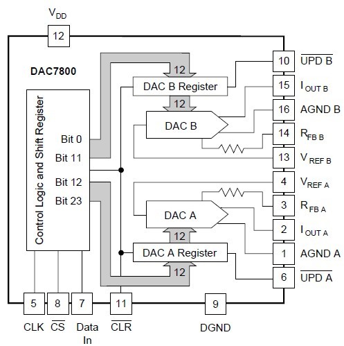 The DAC7801LU is a member of a new family of monolithic dual 12-bit CMOS multiplying Digital-to-Analog Converters (DACs). The digital interface speed and the AC multiplying performance are achieved by using an advanced CMOS process optimized for data conversion circuits. High stability on-chip resistors provide true 12-bit integral and differential linearity over the wide industrial temperature range of -40℃ to +85℃. The DAC7801LU features a serial interface capable of clockingin data at a rate of at least 10MHz. Serial data is clocked (edge triggered) MSB first into a 24-bit shift register and then latched into each DAC separately or simultaneously as required by the application. An asynchronous CLEAR control is provided for power-on reset or system calibration functions. The DAC7801LU is packaged in a 16-pin 0.3 wide plastic DIP.
