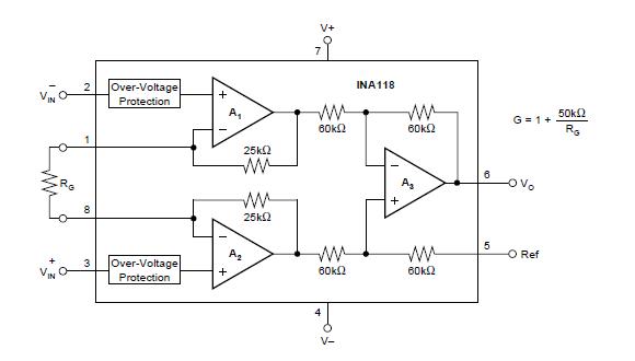 INA118PB absolute maximum ratings: (1)Supply Voltage: ±18V; (2)Analog Input Voltage Range: ±40V; (3)Output Short-Circuit (to ground): Continuous; (4)Operating Temperature: –40 to +125℃; (5)Storage Temperature: –40 to +125℃; (6)Junction Temperature:. +150℃; (7)Lead Temperature (soldering, 10s): +300℃.