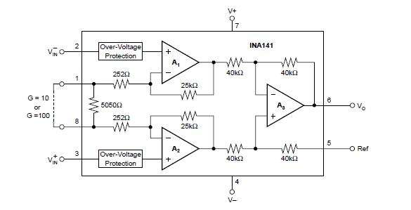 INA141UA features: (1)low offset voltage: 50mV max; (2)low drift: 0.5mV/℃ max; (3) Accurate gain: ±0.05% at G = 10; (4) low input bias current: 5nA max; (5) high CMR: 117dB min; (6) inputs protected to ±40V; (7) wide supply range: ±2.25 to ±18V; (8) low quiescent current: 750mA; (9)8-pin plastic DIP, SO-8.