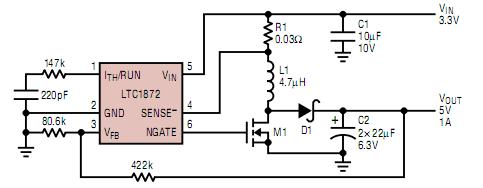 LTC1872ES6#TRPBF absolute maximum ratings: (1)Input Supply Voltage (VIN):–0.3V to 10V; (2)SENSE–, NGATE Voltages:–0.3V to (VIN + 0.3V); (3)VFB, ITH/RUN Voltages:–0.3V to 2.4V; (4)NGATE Peak Output Current (<10μs):1A; (5)Storage Ambient Temperature Range:–65℃ to 150℃; (6)Operating Temperature Range:–40℃ to 85℃; (7)Junction Temperature:150℃; (8)Lead Temperature (Soldering, 10 sec):300℃.