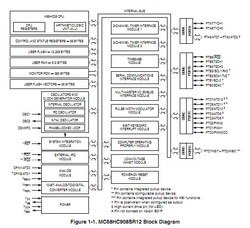MC908SR12MFAE features: (1)High-performance M68HC08 architecture; (2)Fully upward-compatible object code with M6805, M146805, and M68HC05 Families; (3)Maximum internal bus frequency: 8-MHz at 5V operating voltage; 4-MHz at 3V operating voltage; (4)Clock input options: RC-oscillator; 32kHz crystal-oscillator with 32MHz internal phase-lock-loop; (5)12k-bytes user program FLASH memory with security1 feature; (6)512 bytes of on-chip RAM; (7)Two 16-bit, 2-channel timer interface modules (TIM1 and TIM2) with selectable input capture, output compare, and PWM capability on each channel; (8)Timebase module; (9)3-channel, 8-bit high speed PWM (125kHz) with independent counters and automatic phase control; (10)Serial communications interface module (SCI).