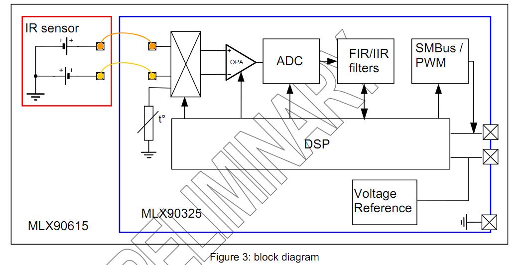 MLX90615ESG-DAA features: (1)Small size, low cost; (2)Easy to integrate; (3)Factory calibrated in wide temperature range: -40 to 85℃ for sensor temperature and -40 to 115℃ for object temperature. ; (4)High accuracy of 0.5℃ over wide temperature range (0 to +50℃ for both Ta and To) ; (5)High (medical) accuracy calibration; (6)Measurement resolution of 0.02℃; (7)SMBus compatible digital interface; (8)Power saving mode; (9)Customizable PWM output for continuous reading; (10)Embedded emissivity compensation; (11)3V supply voltage.