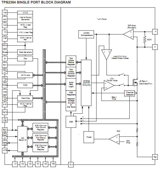 TPS2384PJD features: (1)Quad-Port Power Management With Integrated Switches and Sense Resistors; (2)Compliant to IEEE 802.3af Standard; (3)Operates from a Single 48-V Input Supply; (4)Individual Port 15-bit A/D; (5)Auto, Semi-Auto and Manual Operating Modes; (6)Controlled Current Ramps for Reduced EMI and Charging of PD’s Bulk Capacitance; (7)I2C Clock and Oscillator Watch Dog Timers; (8)Over-Temperature Protection; (9)DC and DC Modulated Disconnect; (10)Supports Legacy Detection for Non-Compliant PD; (11)Supports AC Disconnect; (12)High-Speed 400-kHz I2C Interface; (13)Comprehensive Power Management Software Available; (14)Operating Temperature Range -40 to 125℃.