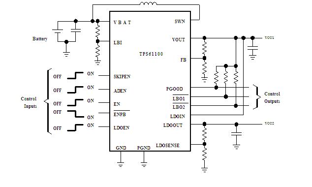 The TPS61100PW is a dual-output single-cell boost converter. The TPS61100PW provides a complete power supply solution for products powered by either one or twoAlkaline, NiCd, or NiMH battery cells. The converter generates two stable output voltages that are either adjustedby an external resistor divider or fixed internally on the chip. It stays in operation with supply voltages down to0.8 V. The implemented boost converter is based on a fixed frequency, pulse-width-modulation (PWM) controllerusing a synchronous rectifier to obtain maximum efficiency. The applications of the TPS61100PW include All Single or Dual Cell Battery Operated Products Which Use Two System Voltages Like DSP C5X Applications, Internet Audio Player, PDAs, Digital Still Cameras and Other Portable Equipment.